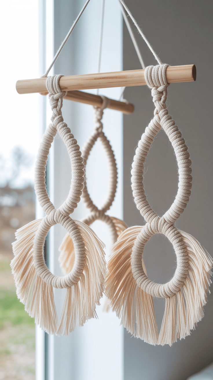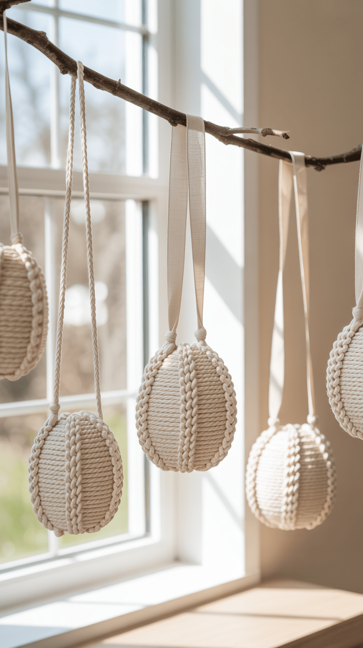 Feine Makramee-Kordeln umschließen luftige Ei-Formen und werden anschließend an zarten Bändern aufgehängt. So schweben sie in verschiedenen Höhen und erzeugen spielerische Leichtigkeit am Fenster oder über dem Tisch. Durch die Wahl von Naturfarben bleibt die Dekoration beruhigend und fügt sich harmonisch in ein minimalistisches Interieur ein.