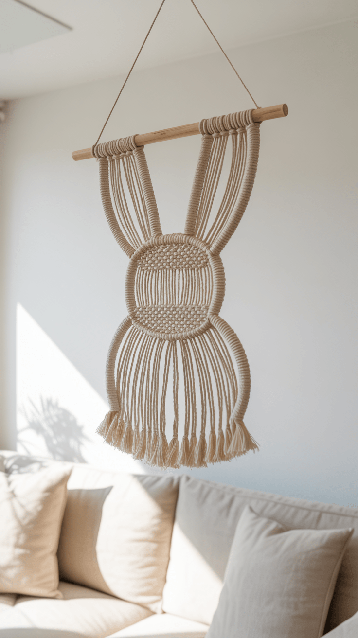Ein filigran geknüpfter Wandbehang im Hasen- oder Kaninchen-Silhouetten-Design verleiht der Wand ein verspieltes, aber dennoch ruhiges Element. Die Kombination aus einfachen Knoten und dezenten Fransen unterstreicht den handwerklichen Charakter. Solche Wandbehänge lassen sich in Flur, Arbeitszimmer oder Kinderzimmer gleichermaßen harmonisch integrieren.