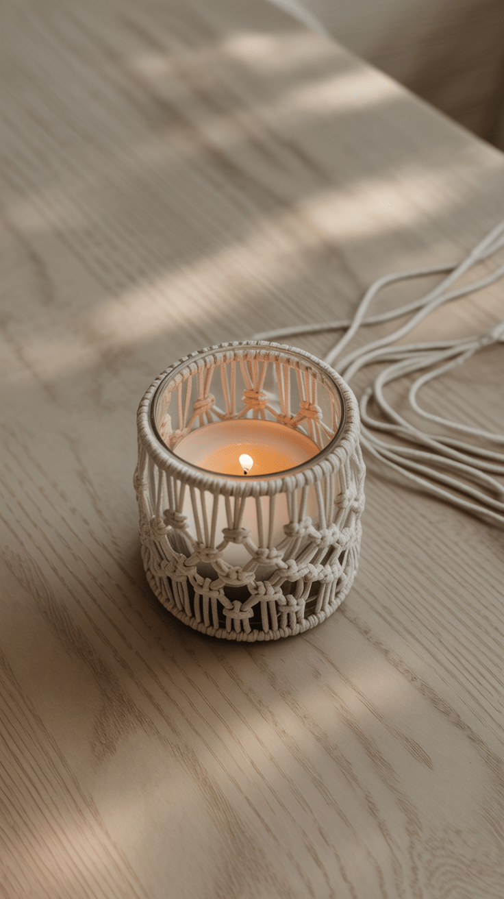 Knüpfe eine Reihe von halben Schlaufenknoten um die Mitte des Windlichts herum und lasse oben und unten Fransen frei hängen. Befestige die Hülle mit einem dezenten Band oder Kordel, damit sie nicht verrutscht.