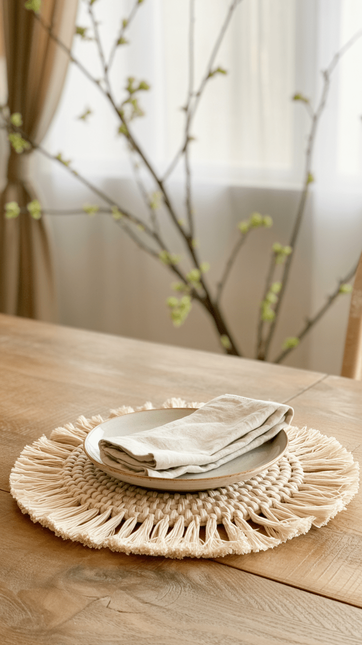 Ein schmaler Tischläufer aus Baumwollgewebe erhält am Rand dekorative Makramee-Fransen. So wirkt der gedeckte Tisch gleichzeitig strukturiert und verspielt. Die Fransen können in sanften Pastellfarben gehalten werden, um das Frühlingsgefühl zu unterstreichen.