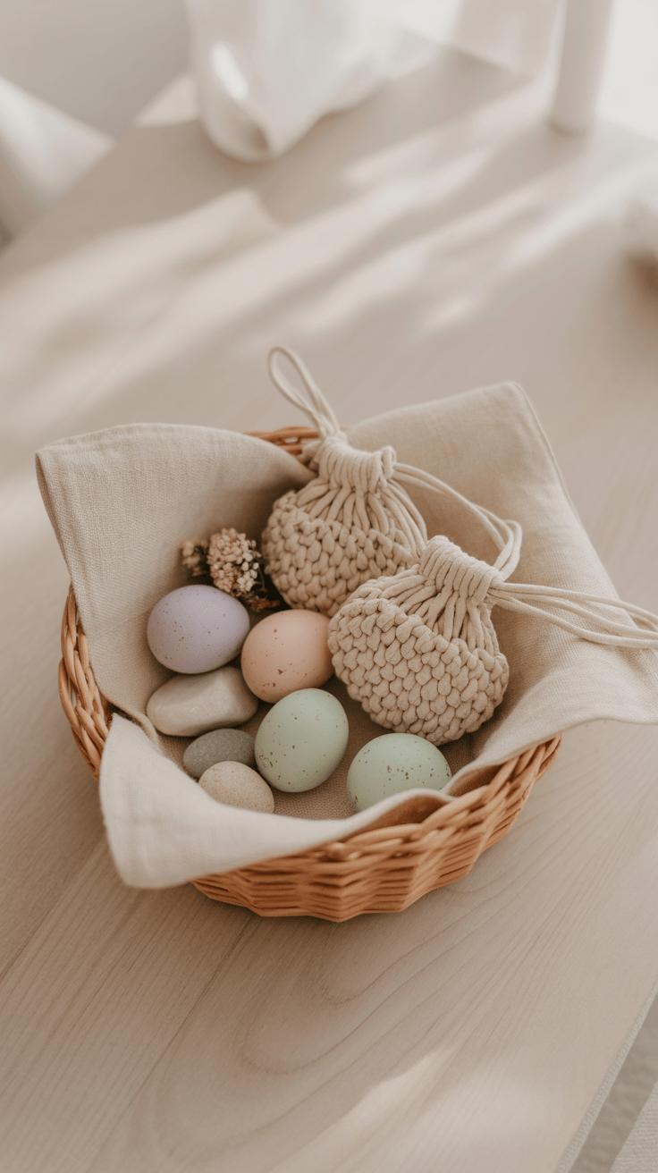 Kleine Geschenke wie Schokoladeneier oder Samenpäckchen finden in zarten Makramee-Beuteln Platz. Die individuell geknüpften Täschchen lassen sich gut am Osterstrauch aufhängen oder in Körbchen gruppieren. So wird jedes Mitbringsel zu einem liebevollen Blickfang.