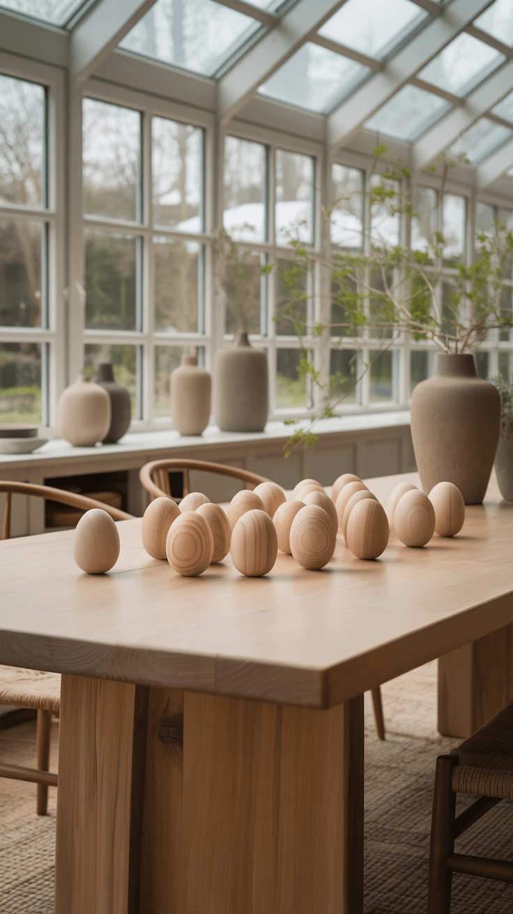 - Bemalte Holzeier in zarten Pastelltönen für eine subtile Farbgebung.