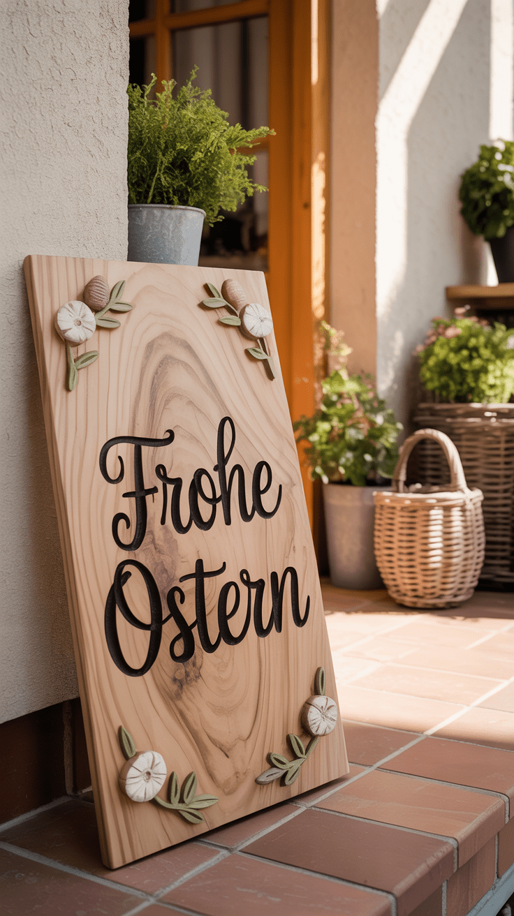 Mit einem handgefertigten Holzschild empfängst du Gäste auf deiner Terrasse auf ganz persönliche Weise. Du schnitzt sanfte, ovale Formen oder lässt eine schlichte, geschwungene Kontur aus der Holzplatte treten. Eine dezente Osterbotschaft ergänzt den natürlichen Rahmen und wirft sanfte Schatten auf das Holz. So entsteht eine einladende Atmosphäre bereits am Eingang.