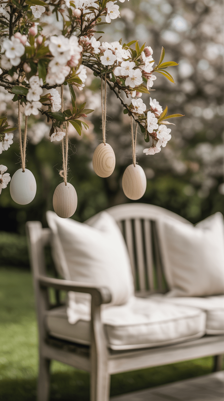 Zwischen Astwerk von Sträuchern und Hecken lassen sich hölzerne Eiformen elegant in Szene setzen. Jedes Ei schwingt leicht im Wind und reflektiert den Himmel auf seiner sanft geschliffenen Oberfläche. Du wählst unterschiedliche Höhen, um Tiefe zu erzeugen und die natürliche Silhouette zu betonen. Das Ergebnis ist ein filigranes Spiel aus Licht, Schatten und Bewegung.