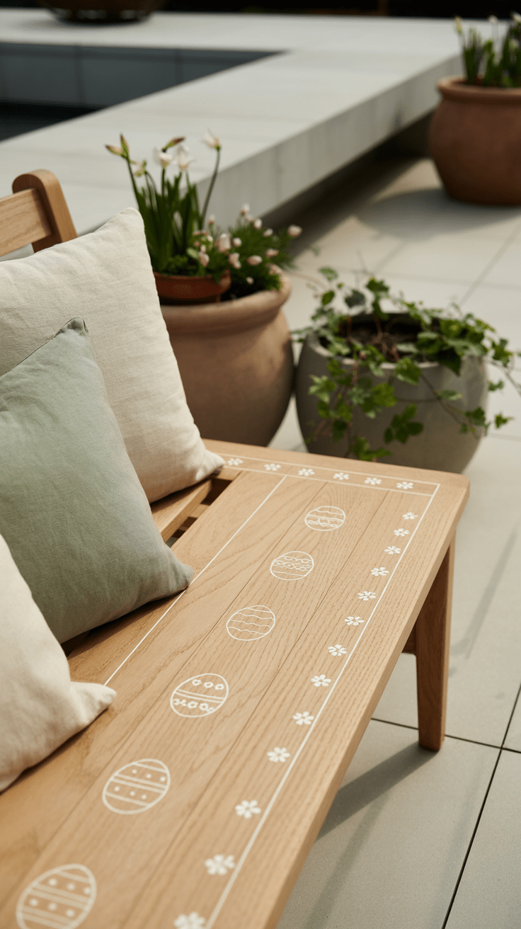 Eine hölzerne Gartenbank wird zum Kunstwerk, wenn du sie mit dezenten Ostermotiven intarsierst. Hasen, Eier oder florale Linien ziehen sich als feine Einlage entlang der Rückenlehne. Sobald du Platz nimmst, genießt du nicht nur die Aussicht, sondern auch die feine Handwerkskunst. Die schlichte Form der Bank unterstützt die Wirkung der Intarsien.