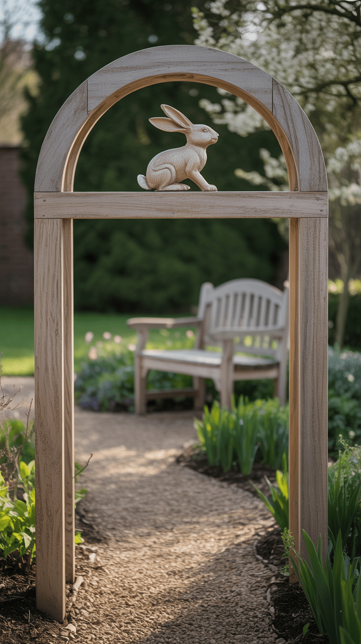 Ein hölzerner Torbogen mit holzgestecktem Hasenmotiv wird zum poetischen Durchgang in deinem Garten. Du baust ein leichtes Holzgestell, an dem eine ausgesägte Hasensilhouette thront. Wenn du den Bogen passierst, begleitest du dich selbst mit einem zarten, österlichen Gruß. Die Struktur aus Holzstäben überträgt dabei Leichtigkeit und Festlichkeit zugleich.