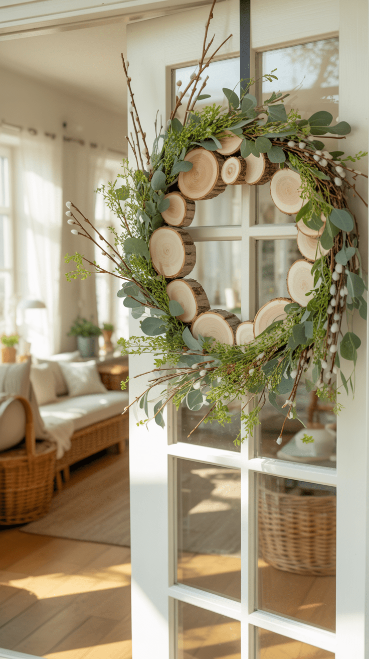 Ein Klassiker erhält durch Holz eine ganz neue, rustikale Ästhetik. Du kreierst einen Kranz aus dünnen Holzscheiben, der sanft am Türrahmen deines Gartenschuppens hängt. Die Kombination aus hellem Holz und frischen Zweigen verleiht dem Eingangsbereich eine harmonische Stimmung. Ganz ohne grelle Farben entsteht ein warmes Willkommen für die Osterzeit.