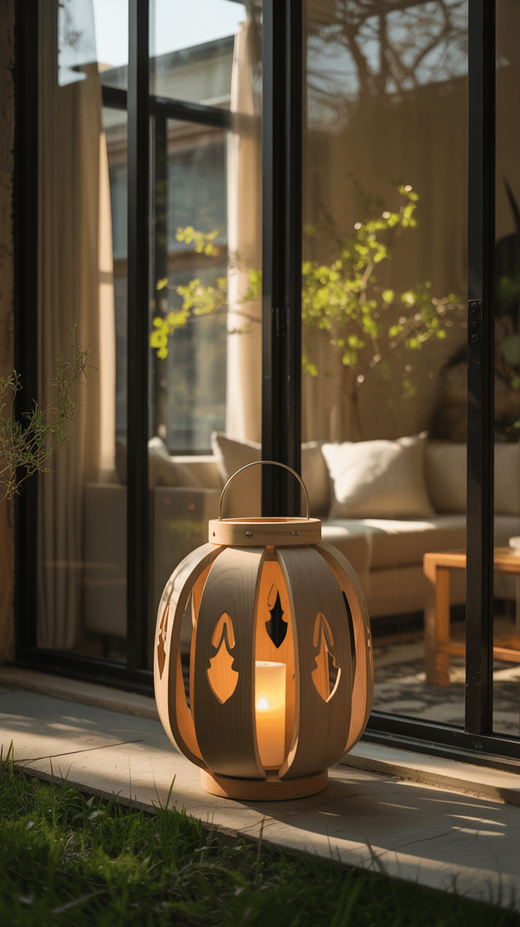 Eine Laterne aus Holz erhält durch präzise ausgesägte Ei-Formen eine sanfte Festlichkeit. Sobald eine Kerze innen leuchtet, werfen die ausgeschnittenen Stellen ein warmes, sanft flackerndes Licht. Die Laterne schmückt sowohl den Terrassenboden als auch einen niedrigen Holztisch. Durch die natürlichen Materialien entsteht ein ruhiges Lichtspiel.