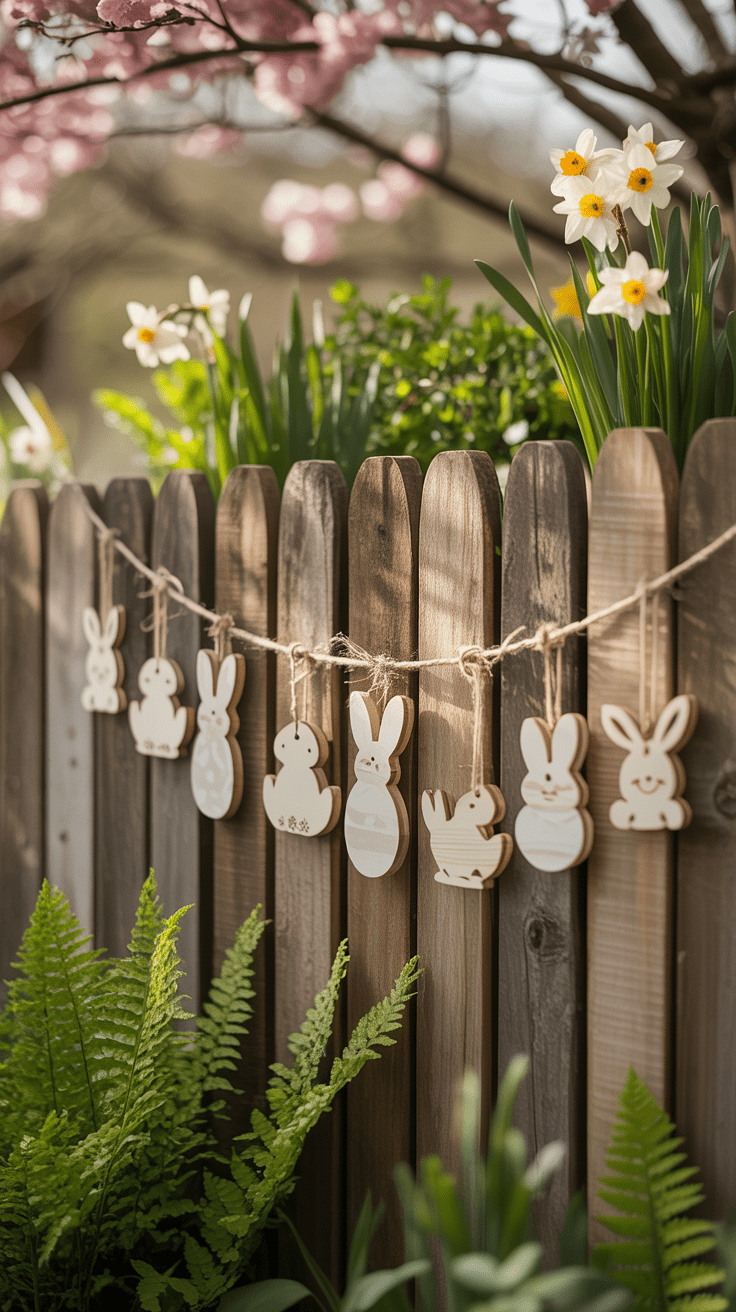 Ein naturnaher Sichtschutz aus Holzzäunen gewinnt durch hängende Anhänger eine dezente Osterstimmung. Du befestigst kleine Holzplatten mit eingravierten Eier- oder Häschenmotiven an feinen Seilen. Die Anhänger bewegen sich im Wind und lockern so den strengen Verlauf des Zauns auf. Dadurch entsteht ein leichtes, ruhiges und verspieltes Bild.