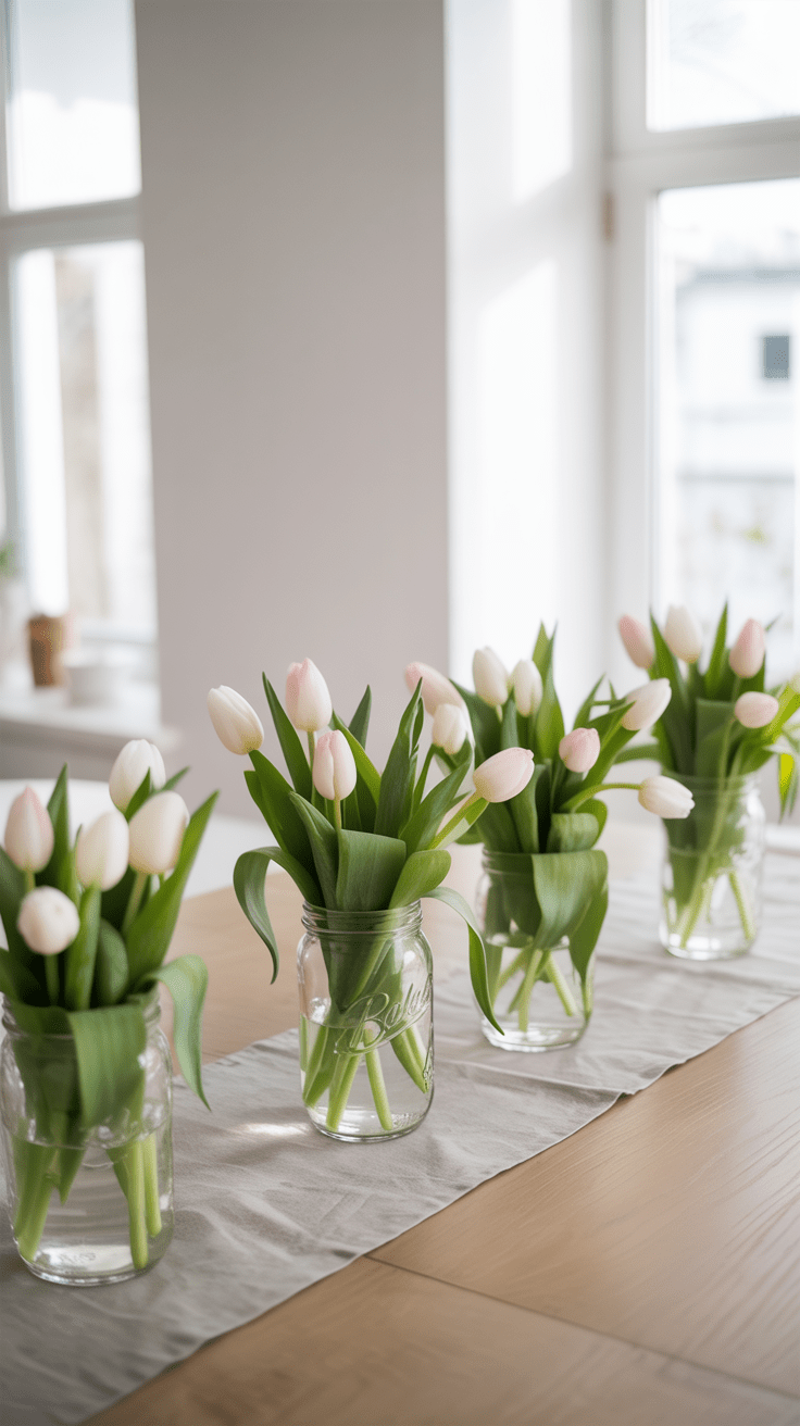 Klassische Tulpen in einem gruppierten Einmachglas wirken modern und bodenständig zugleich. Du füllst sauberes Glas mit Wasser, kürzt die Stiele auf gleiche Länge und arrangierst mehrere Blumen gleichmäßig. Einfarbige Vasen oder kleine Gläser bieten dabei eine ruhige Basis. Diese einfache Umsetzung bringt Frische auf den Esstisch oder die Fensterbank.