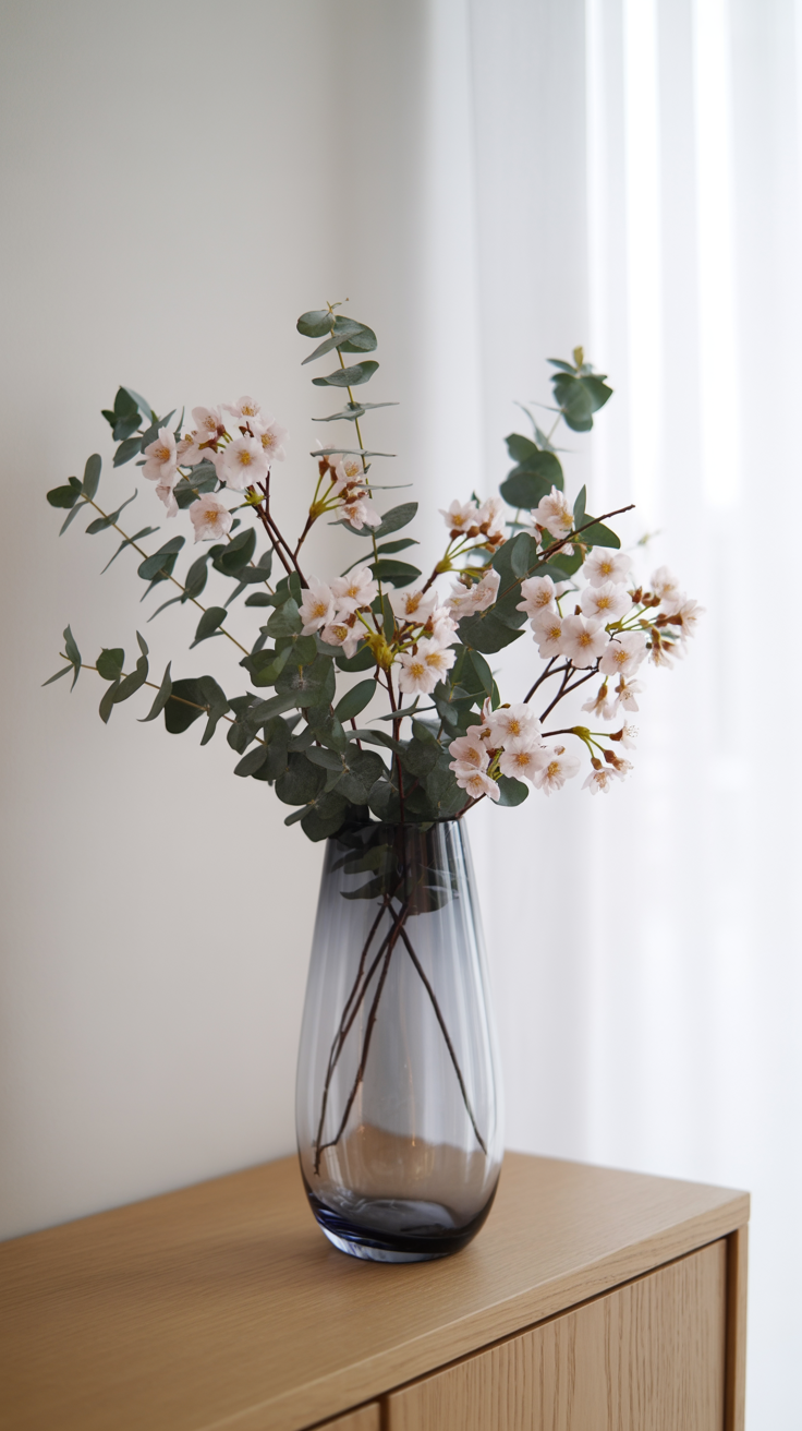 Kombiniere Zweige mit silbrigem Eukalyptuslaub und zarten Kirschzweigen zu einem luftigen Bouquet. Du stellst die Zweige in eine Vase mit hohem Hals und lässt sie locker überkanten. Die frische Note des Eukalyptus harmoniert mit dem zarten Weiß oder Rosé der Kirschblüten. Dieses Arrangement bringt Leichtigkeit und dezenten Duft in den Raum.