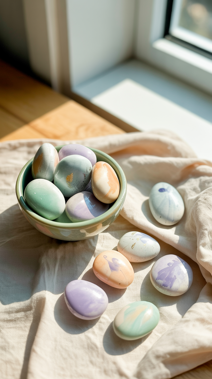 Glatt geschliffene Flusssteine werden mit Acrylfarbe zu kleinen Kunstwerken. Du malst zarte Muster oder pastellige Punkte auf die Steinoberfläche und versiegelst sie mit mattem Klarlack. Die handlichen Naturmaterialien liegen schwer in der Hand und wirken besonders wertig. Als Alternative zu echten Eiern bieten sie eine langlebige Tischdekoration.