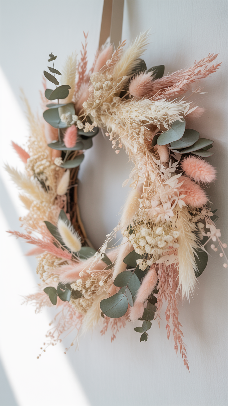 Ein Kranz aus Trockenblumen ist dauerhaft haltbar und zaubert pastellige Nuancen an jede Wand. Du befestigst verschiedene Blumensträußchen mit Blumendraht auf einem Metallring. Die Mischung aus Strohblumen, Statice und Lagurus sorgt für Struktur und Leichtigkeit. So entsteht eine idyllische Wanddekoration, die das ganze Jahr Freude schenkt.
