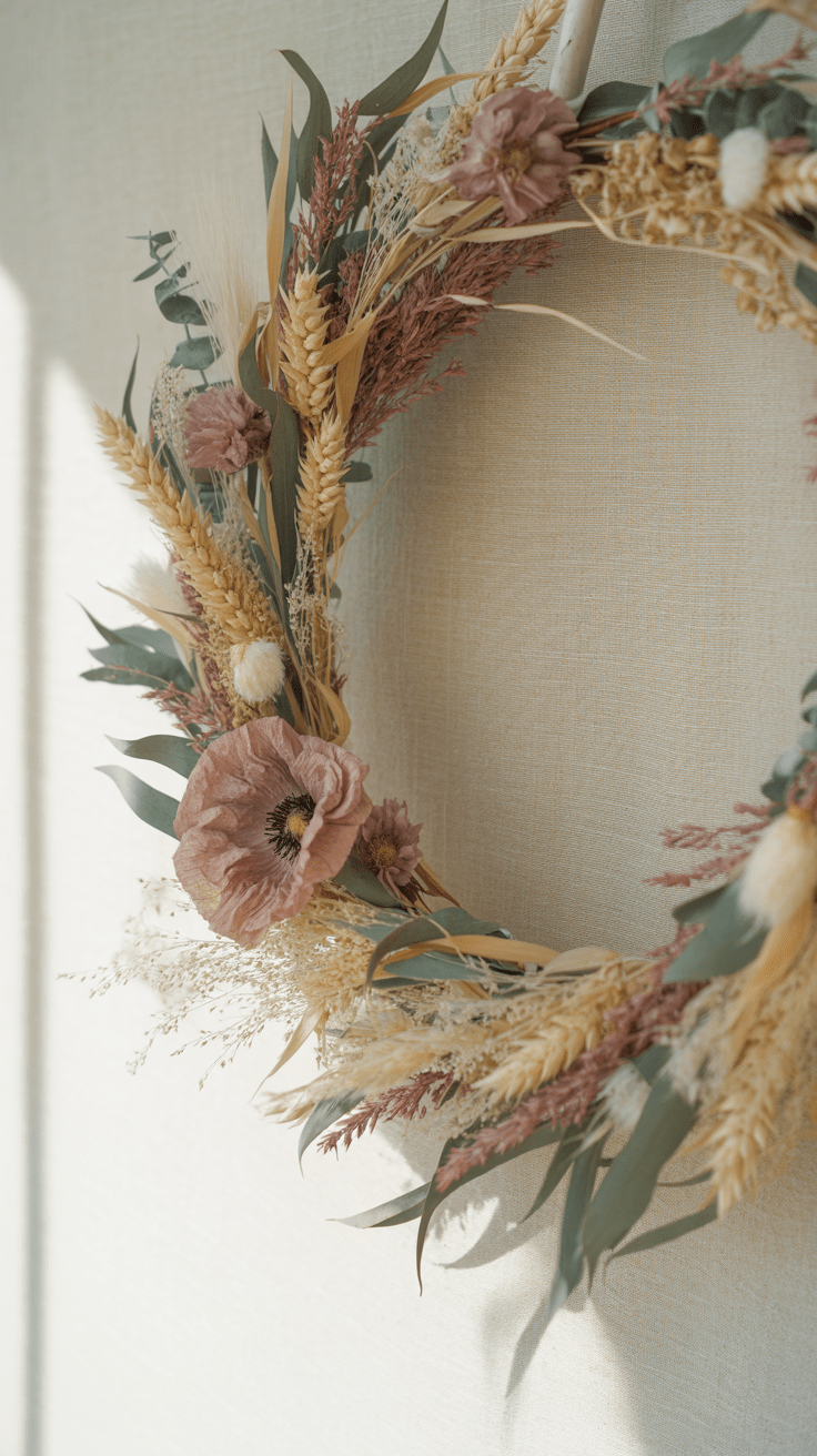 Getrocknete Blumenkränze sind besonders robust und benötigen keine Pflege. Sie fangen Licht und Schatten ein, sodass ihr Eindruck je nach Tageszeit lebendig wirkt. Durch die Kombination verschiedener Blüten und Gräser entsteht ein natürlicher, handgemachter Charakter, der jede Dekoration bereichert. Gleichzeitig sparst du Zeit für aufwändige Frischblumenpflege.