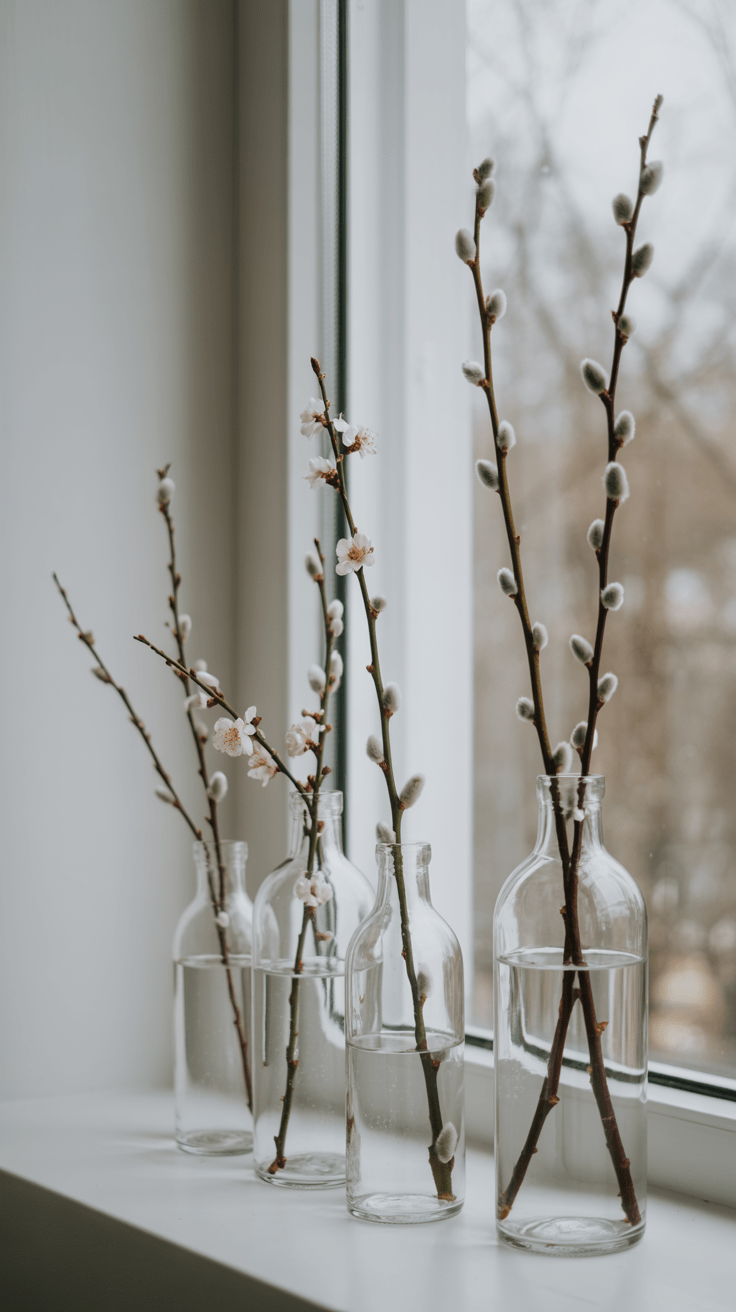 13. Glasflaschen-Vasen mit Frühlingszweigen