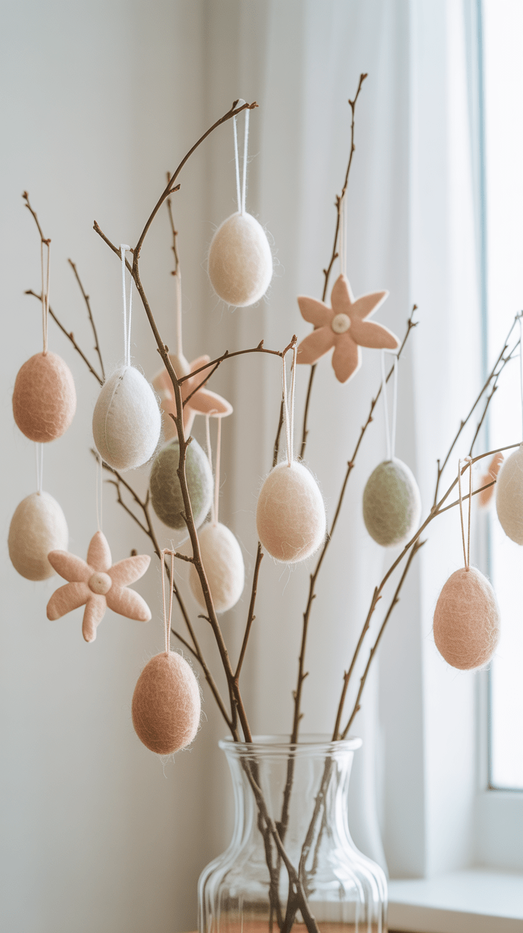 Leicht und farblich dezent wirken Filzanhänger in Form von Eiern, Häschen oder Blumen, die du an Zweige bindest. Diese DIY-Dekoration fängt das Licht und schwingt sanft im Luftzug. Du kannst verschiedene Naturtöne kombinieren, um eine harmonische Farbwelt zu schaffen. Solche Anhänger sind nicht nur zu Ostern schön, sondern begleiten dich noch lange als saisonale Deko.