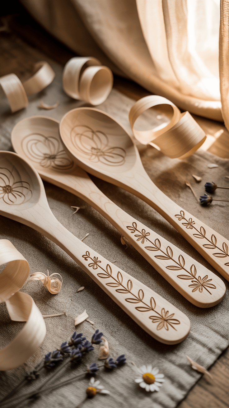 Holzlöffel mit filigranen Gravuren verbinden praktischen Nutzen mit künstlerischer Ästhetik. Mit einfachen Blumenmotiven oder personalisierten Initialen veredelst du jeden Löffel. Diese Geschenke sind langlebig, nachhaltig und schaffen eine warme Atmosphäre in der Küche. Durch die natürliche Maserung des Holzes wird jeder Löffel einzigartig.