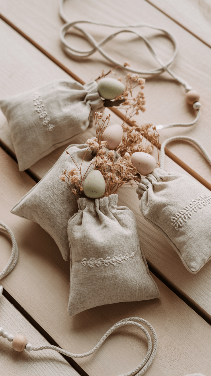 Ein kleiner Beutel aus Leinenstoff macht sich besonders gut als Geschenkverpackung für süße Kleinigkeiten oder Samenbomben. Die natürliche Materialität des Leinens wirkt zugleich rustikal und edel. Mit schlichter Stickerei oder einem gedruckten Ostermotiv verleihst du jedem Beutel einen individuellen Touch. So entsteht ein langlebiges, wiederverwendbares Präsent.