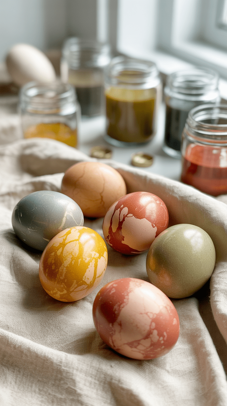 Das Marmorieren von Eiern mit natürlichen Farbstoffen wie Rote-Bete-Saft, Kurkuma oder Spinat zaubert einzigartige Muster auf die Schale. Diese Technik wirkt zugleich künstlerisch und bodenständig. Jedes Ei wird zum kleinen Kunstwerk, das sich hervorragend als Geschenk oder Tischdekoration eignet. Die zurückhaltenden, erdigen Farbschattierungen verleihen deinen Ostereiern einen natürlichen Charme.