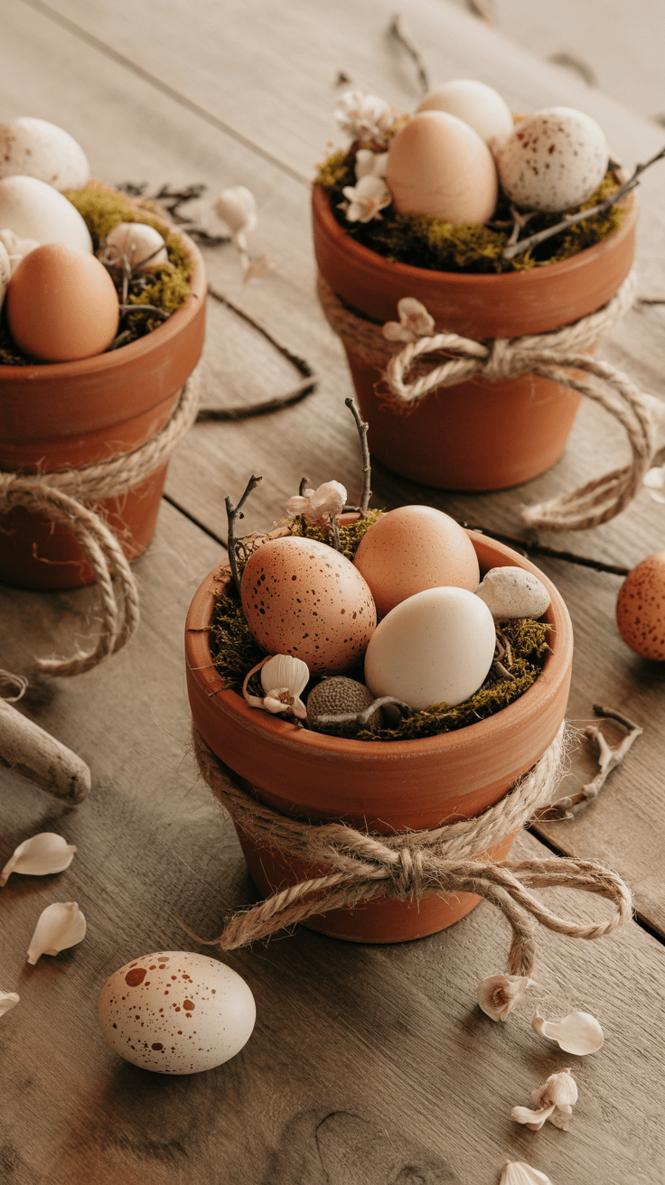 Terrakotta bietet eine natürliche Farbpalette, die sich hervorragend mit zarten Texturen kombinieren lässt. Juteband oder Sisalschnur lassen sich einfach um den Topf legen und bringen eine handgemachte Note. Trockenblüten streuen einen leichten Hauch von Wildblumenwiesen auf jedes Nest. Das Zusammenspiel von Material und Dekor ist hier besonders stimmig.
