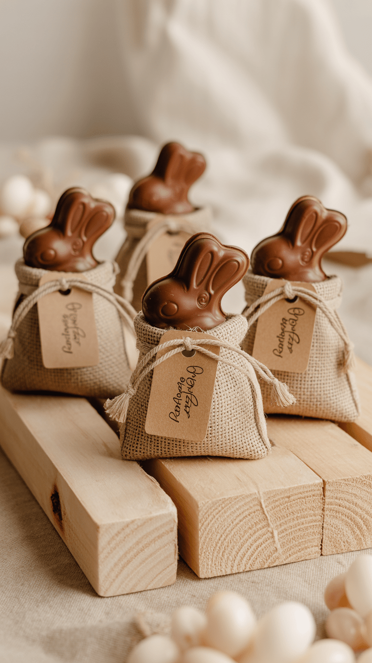 Kleine Bio-Schokoladen-Hasen finden in einem naturbelassenen Jutebeutel eine charmante Verpackung. Das rustikale Material unterstreicht den ökologischen Charakter der Süßigkeit und fühlt sich haptisch angenehm an. So kreierst du ein liebevolles Mitbringsel, das Genuss und Nachhaltigkeit vereint. Ein zartes Band verschließt den Beutel und rundet das Bild ab.