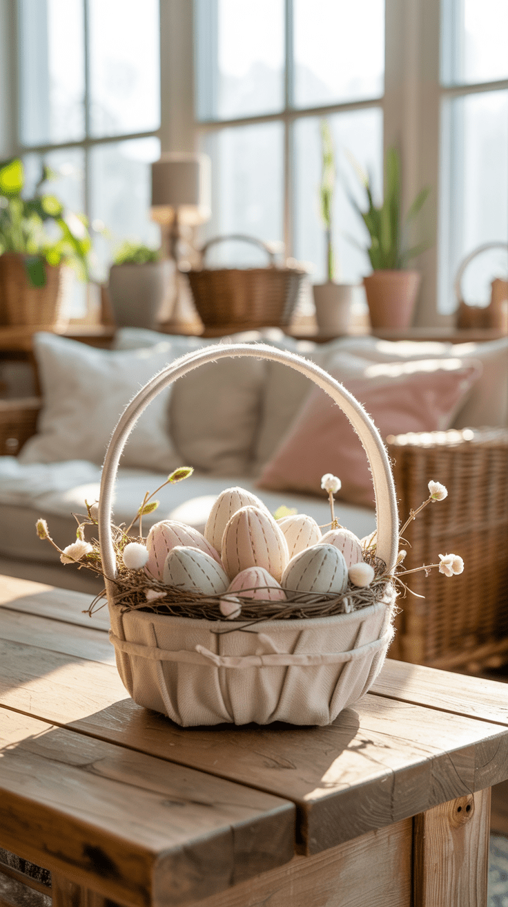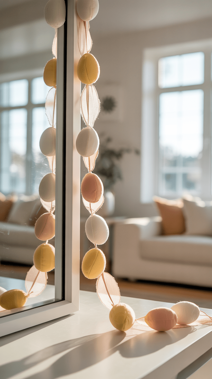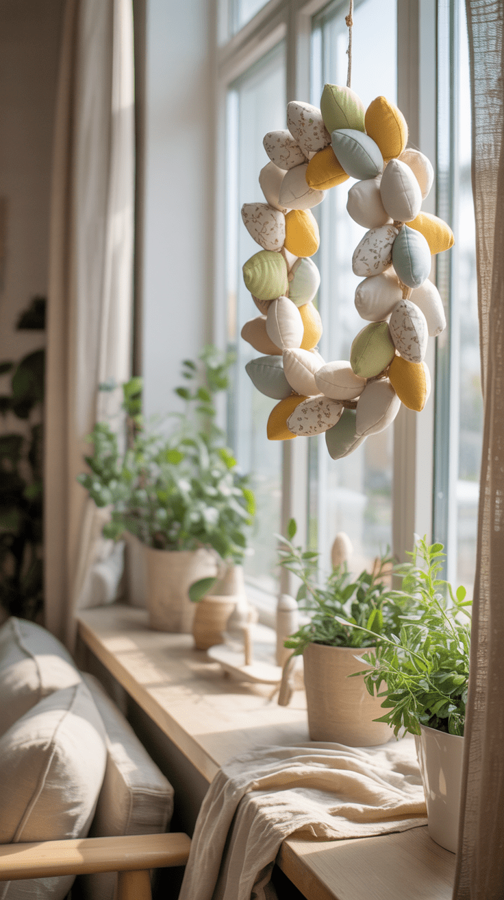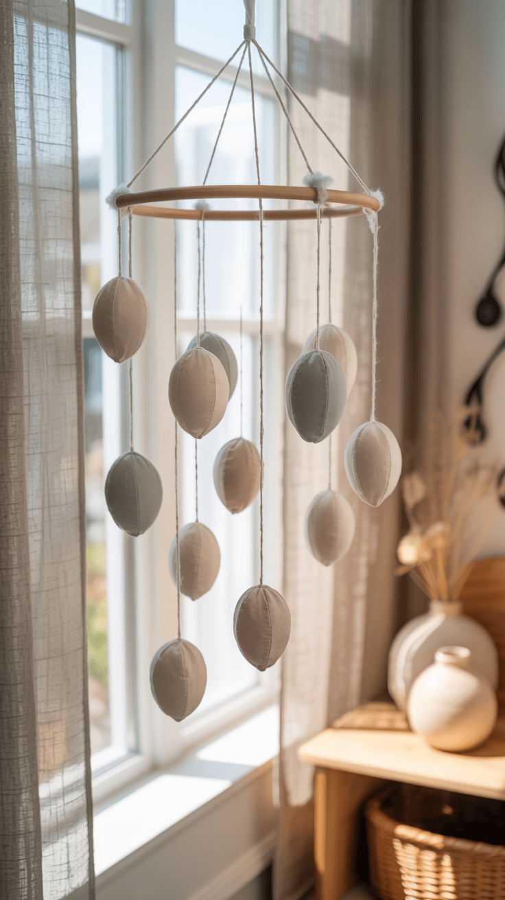 Ein Mobile aus verschiedenen Stoffeiern schwebt leicht über deinem Esstisch oder Fensterbank. Du nähst unterschiedlich große Eier und befestigst sie an variierenden Längen an einem Holzring. So entsteht ein zarter Tanz im Raum.