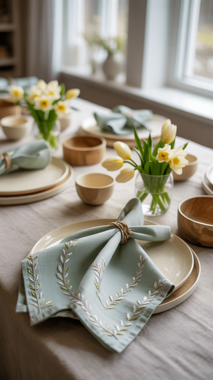 Bestickte Servietten wirken unaufdringlich und unterstreichen die liebevolle Tischgestaltung. Sie lassen sich immer wieder neu arrangieren und verleihen jeder Tafel einen dezenten, handgefertigten Charme.