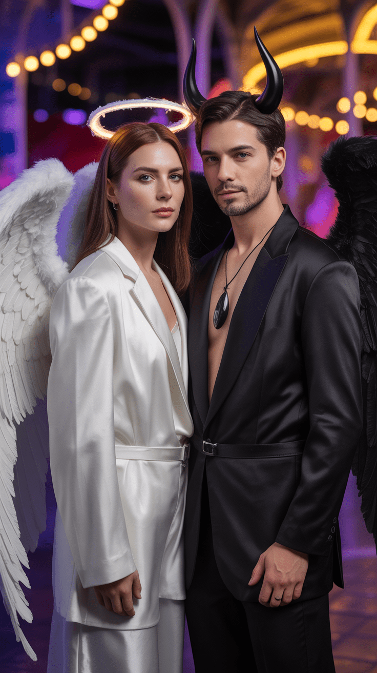 Dieses Partnerkostüm ist ein Klassiker, wirkt aber modern und erwachsen, wenn ihr es reduziert umsetzt. Statt Flügel und Hörner stehen Farben und Haltung im Vordergrund. Weiß trifft auf Schwarz. Mehr braucht es nicht.