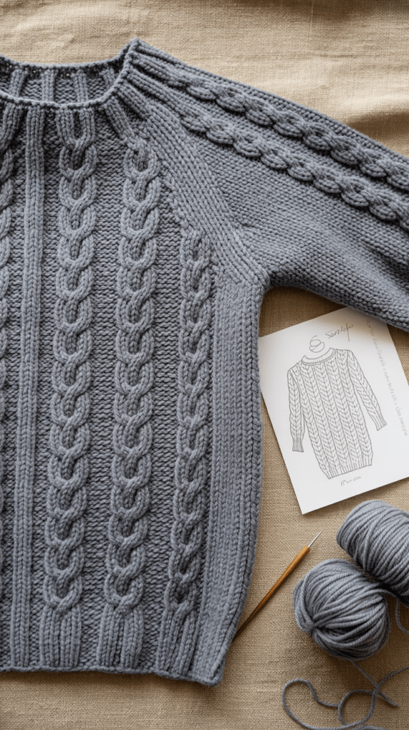 Zopfmuster bringen Tiefe und Struktur in jeden Pullover. Hier nutze ich schmale Zöpfe in Kombination mit glattem Grundmuster. Das Ergebnis wirkt elegant und handwerklich zugleich.