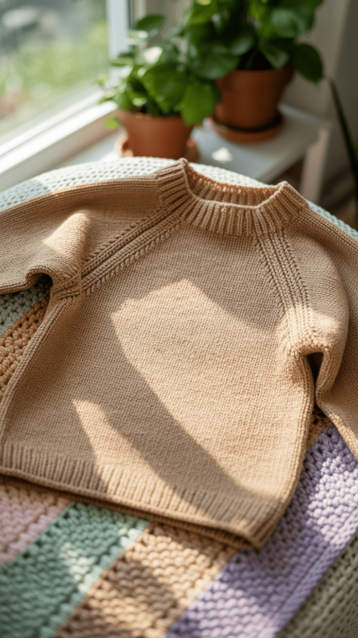Wechsle bei der Raglanlinie zu einem kontrastierenden Garn für ein dezentes Detail. Eine Garnprobe vorab hilft, die richtige Passform zu treffen. Am Ende den Pullover vorsichtig spannen und anfeuchten, um alle Linien zu glätten.