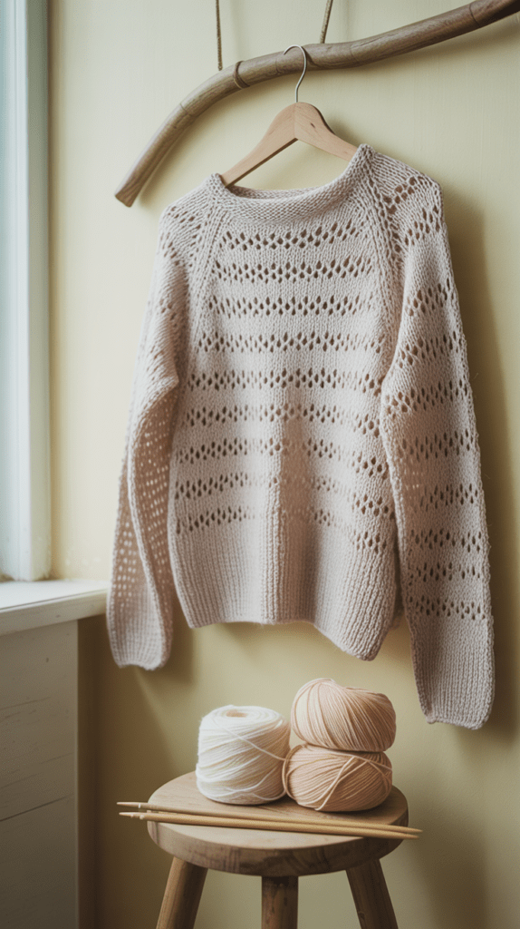 Eine großzügige Maschenprobe hilft, das Muster vollständig abzubilden und den Pullover passend zu gestalten. Nach dem Stricken das Stück leicht dehnen und fixieren, damit sich die Löcher optimal öffnen.