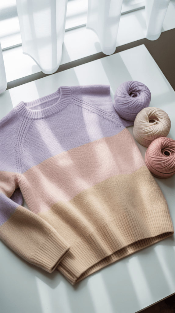 Beim Farbwechsel achte auf einen sauberen Übergang und starte neue Fäden immer an der Seitennaht. Du kannst die Proportionen der Blöcke nach Belieben anpassen, um den Pullover persönlich zu gestalten.