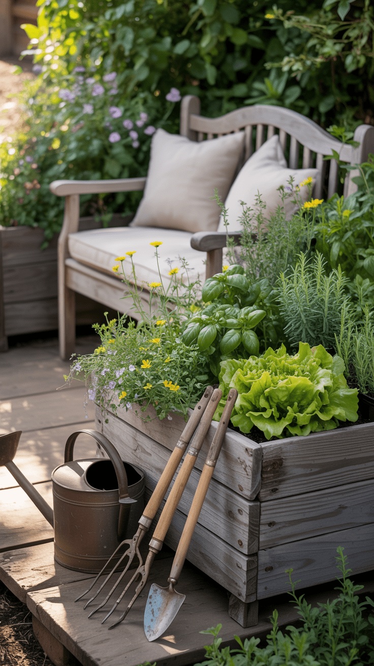 Praktisch und schön zugleich: Diese Sitzecke verbindet Entspannung mit Selbstversorgung. Eine Bank zwischen Hochbeeten wird zum ruhigen Beobachtungspunkt – während Lavendel, Erdbeeren und Tomaten um dich herum wachsen.