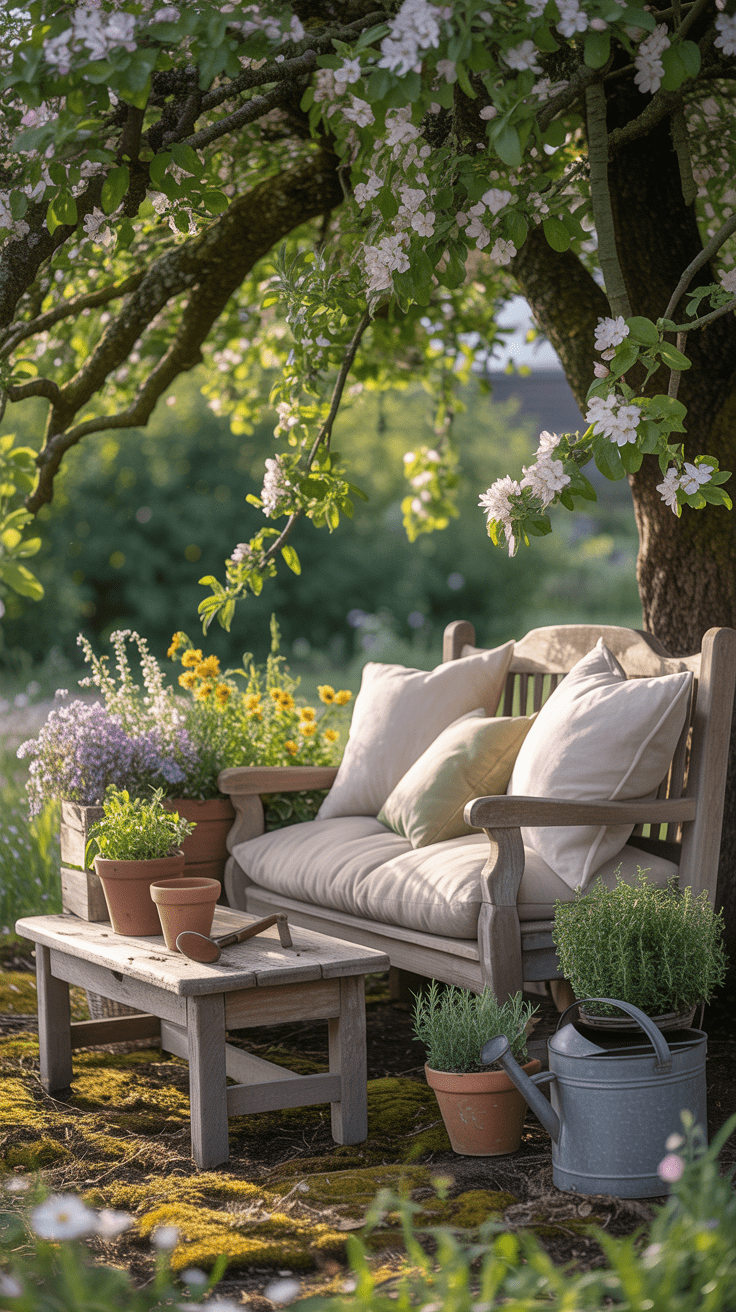 Kennst du diese Plätze, die von Natur aus Ruhe ausstrahlen? Eine rustikale Holzsitzgruppe unter einem alten Apfelbaum gehört genau dazu. Hier fällt das Sonnenlicht gefiltert durch die Blätter, während du mit einem Glas Limo in der Hand einfach mal durchatmest. Massive Holzmöbel, grobe Kissenstoffe und der Duft von Obstblüten machen diese Sitzecke zu einem Lieblingsplatz für jeden Tag.
