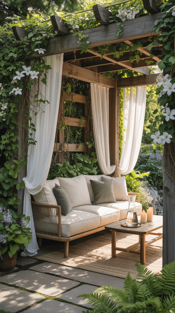 • Outdoor-Vorhänge, Sitzgruppe und stimmungsvolle Beleuchtung.