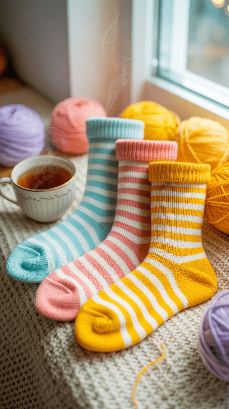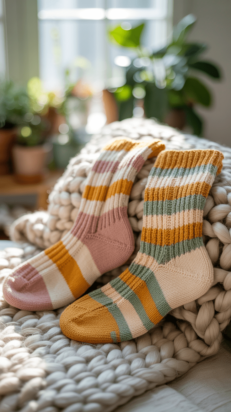 Streifensocken sind ein zeitloser Klassiker. Sie eignen sich besonders, wenn du Reste aus verschiedenen Garnen verarbeiten möchtest. Die gleichmäßigen Streifen sind schnell anpassbar und behalten immer ihren Charme.