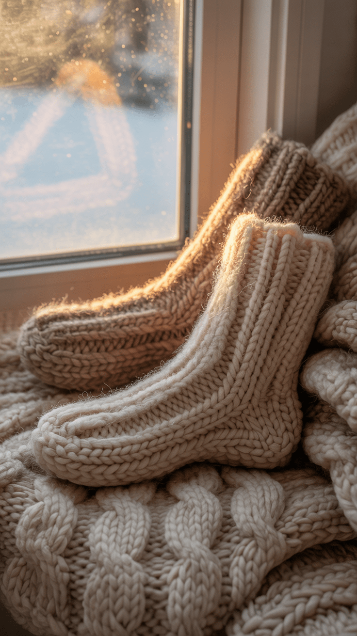 Wohlsocken mit dickem Garn und einfachem Bündchen sind der Inbegriff von Gemütlichkeit. Sie lassen sich schnell stricken und bringen warme Füße im Winter. Ideal für Zuhause.