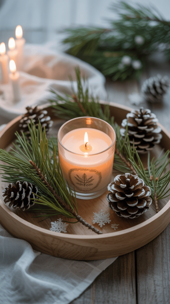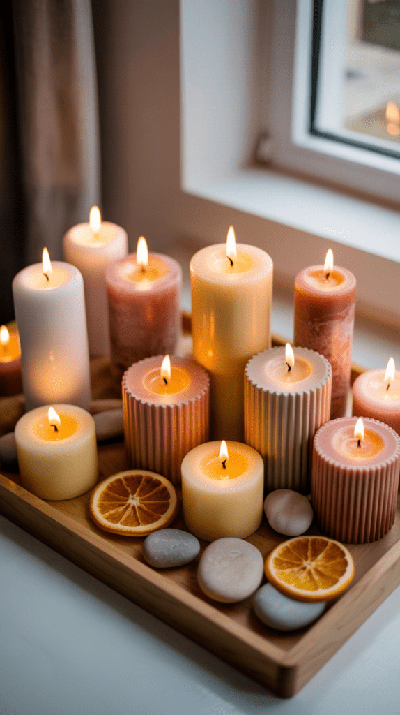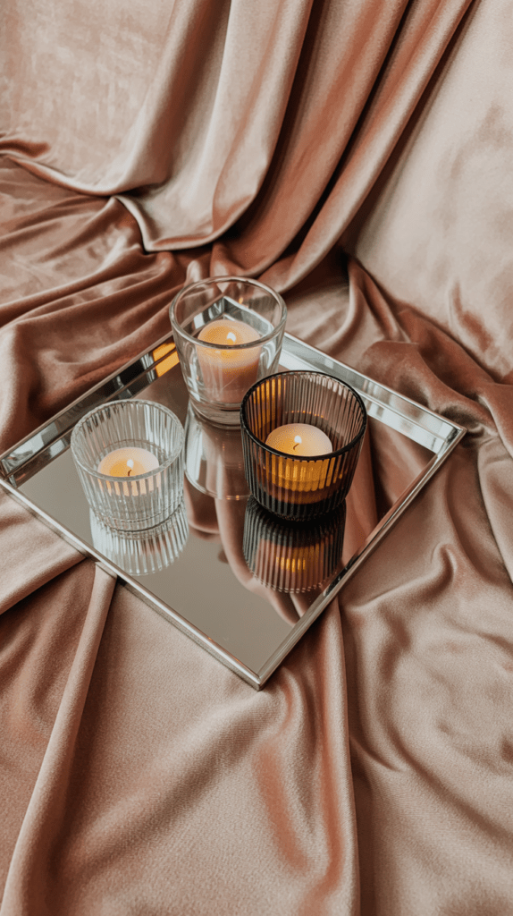 Ein Tablett mit mehreren Duftkerzen in sanften Pastelltönen wirkt wie ein kleines Stimmungslicht. Wähle Kerzen mit natürlichem Wachs und dezenten Düften wie Vetiver, Sandelholz oder Bergamotte. Achte darauf, dass die Kerzen unterschiedliche Höhen und Formen haben.