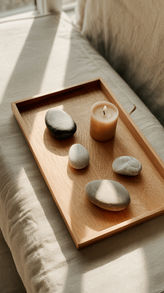 Platziere drei bis fünf Steine in unterschiedlicher Größe locker auf dem Tablett und ergänze sie mit einer kleinen Kerze in hellem Beige. So entsteht ein beruhigender Kontrast zwischen den organischen Formen. Achte darauf, genug Negativraum zu lassen, damit jedes Element seine Wirkung entfalten kann.