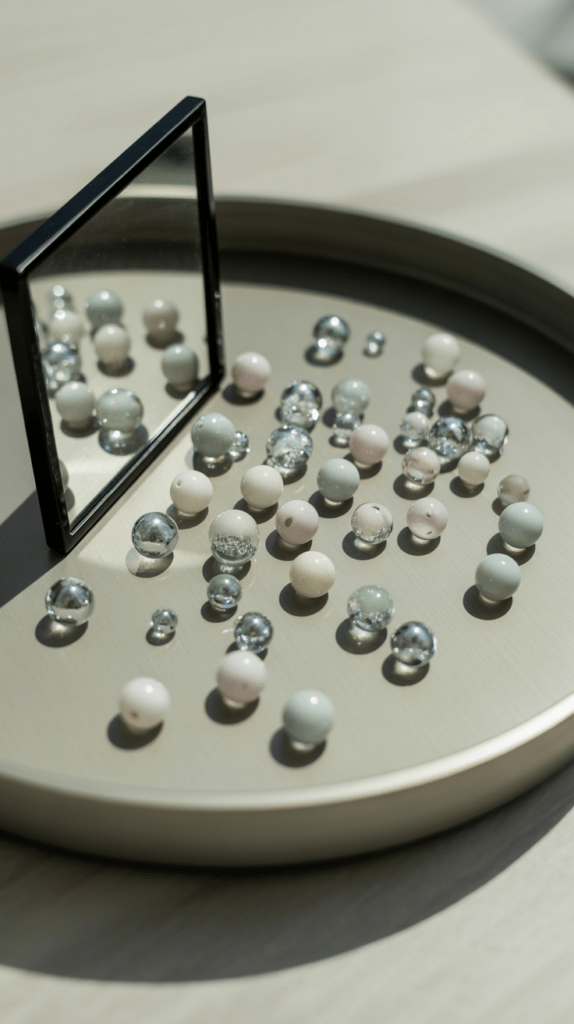 Ein Tablett mit glitzernden Glasperlen und einem kleinen Spiegel schafft subtile Lichteffekte. Streue die Perlen in klaren oder pastelligen Farben auf das Tablett und platziere einen kleinen Spiegel in der Mitte. Das Licht bricht sich in den Perlen und wirft zarte Reflexe.