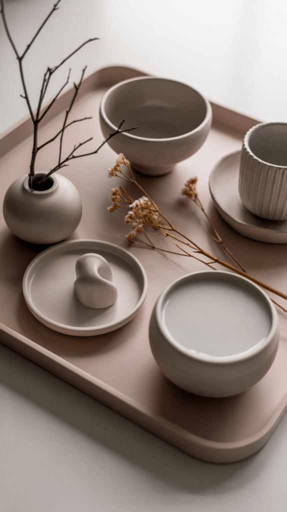 Ein Ton-in-Ton-Arrangement schafft eine entspannte Atmosphäre, die das Auge beruhigt. Wähle ein Tablett in einem sanften Beige oder zarten Grau und ergänze es mit Keramikschälchen in derselben Farbpalette. Ein paar gekochte Zweige oder getrocknete Blätter fügen ein organisches Element hinzu.
