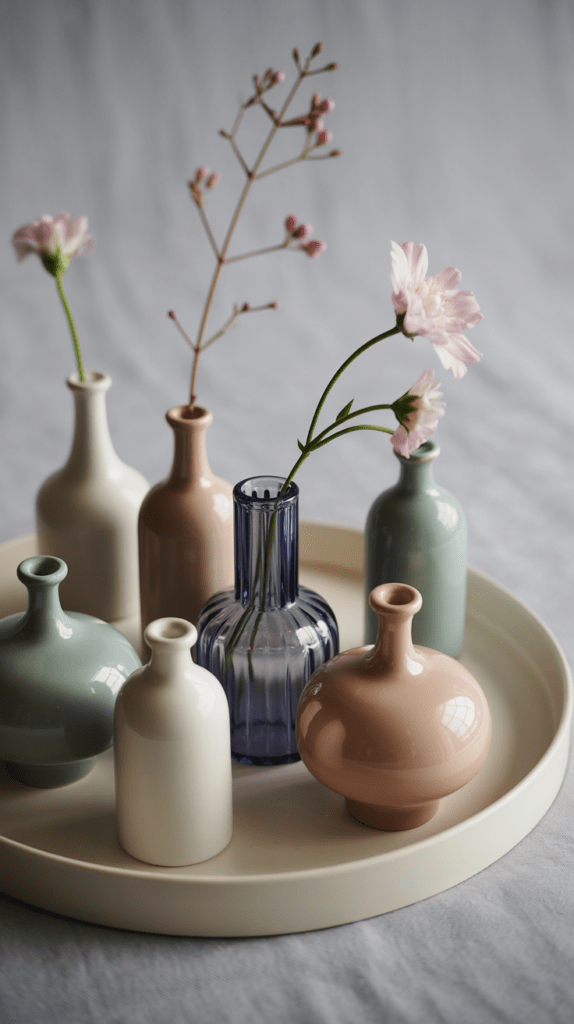 - Kleine Keramik- oder Glasväschen in Pastelltönen oder gebrochenem Weiß.