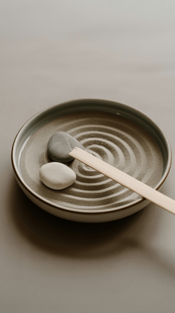 Wähle eine Schale in Naturtönen und fülle sie vorsichtig mit hellem Sand. Platziere die Kiesel in einem lockeren Muster und ergänze einen schmalen Holzstab. Stelle das Ensemble in eine ruhige Ecke und nimm dir regelmäßig einen Augenblick, um den Sand neu zu ordnen.