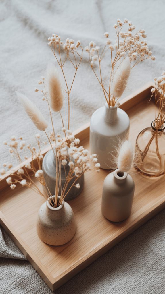 - Kleine Glasvasen oder schmale Keramikgefäße in Weiß- oder Beigetönen.