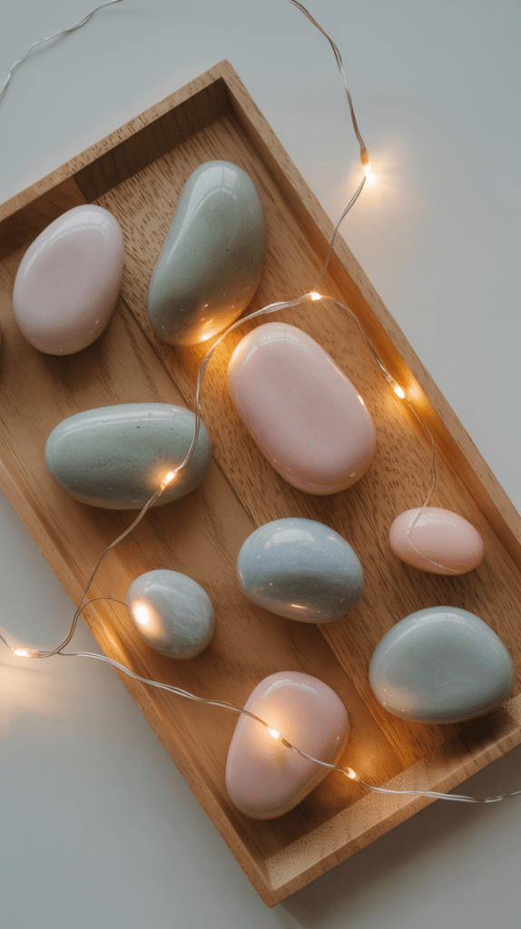 Die Pastellsteine bringen einen Hauch von Frische ins Dekor, während die Lichterkette flirrende Lichtpunkte erzeugt. Die Kombination wirkt verspielt und doch zurückhaltend, weil die Farben zart bleiben.