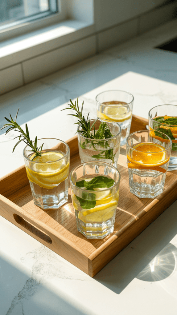 Transparente Gläser füllen dein Tablett mit lebendiger Frische. Lege ein paar Scheiben Zitrone, Limette oder Orangen hinein und ergänze sie mit frischen Kräuterzweigen wie Rosmarin oder Thymian. Das Zusammenspiel von Farbklecksen und Grün erzeugt Leichtigkeit.