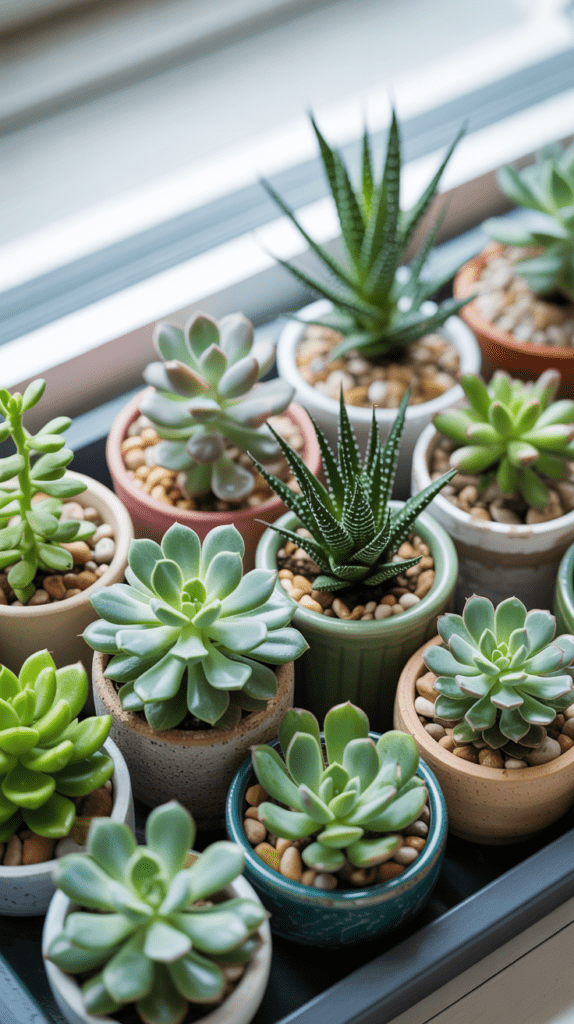 Kleine Sukkulenten in verschiedenen Formen und Grüntönen verwandeln dein Tablett in eine Miniatur-Oase. Wähle Gefäße aus Ton, Keramik oder Glas und setze die Pflanzen eng beieinander. Ihre unterschiedliche Blattstruktur sorgt für Spannung.
