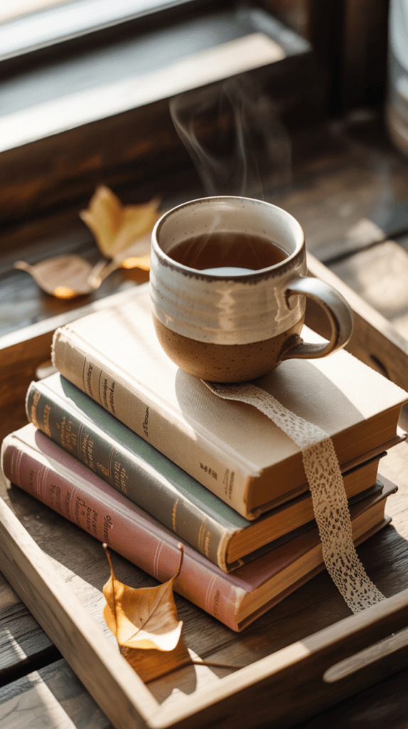 Ein Stack aus alten Büchern mit abgeriebenen Einbänden schafft Tiefe und Geschichte auf deinem Tablett. Darauf setzt du eine rustikale Keramikschale oder eine kleine Tasse. Die Mischung aus Papier und Ton wirkt warm und einladend.