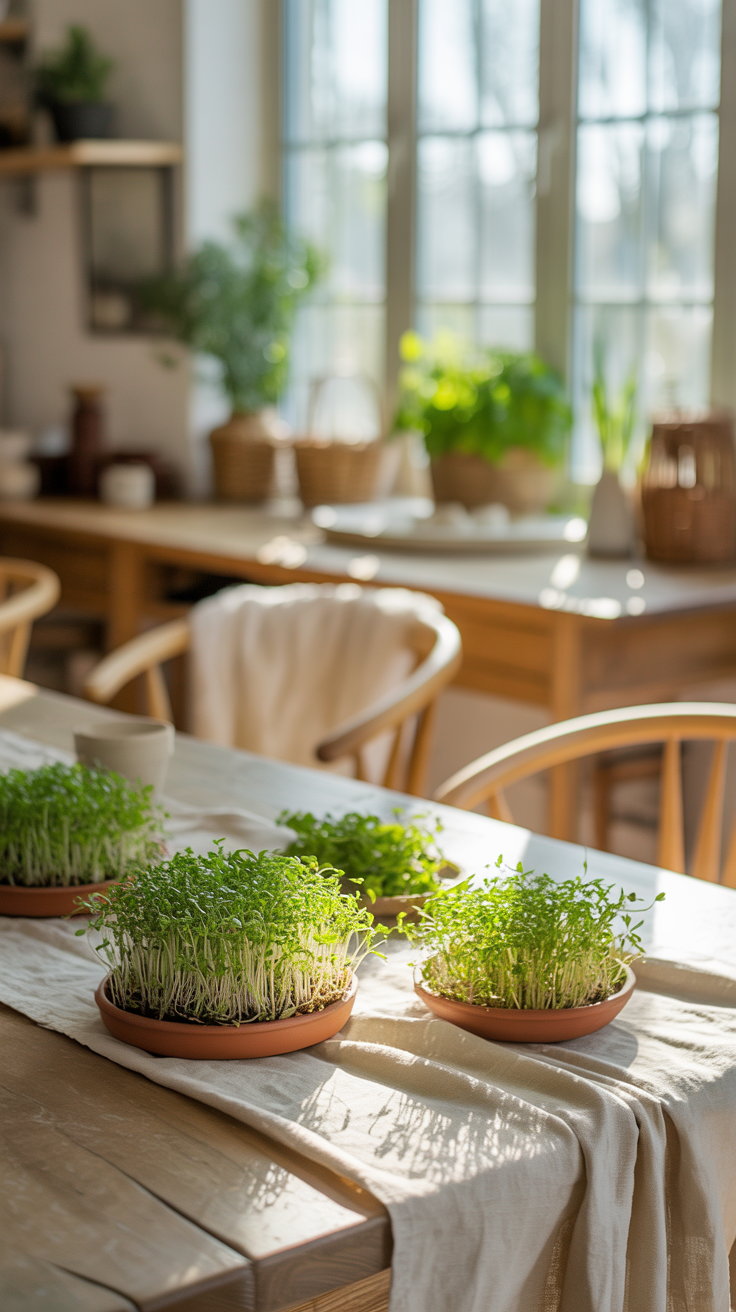 Winzige Schälchen aus Terrakotta bieten Platz für junge Triebe von Kresse oder Sprossen. Das frische Grün kontrastiert lebhaft mit dem gedämpften Orangebraun der Schalen. So entsteht ein lebendiges Detail, das die Frühlingsstimmung direkt auf den Tisch bringt. Jeder Gast kann beim Essen das zarte Grün bewundern und vielleicht sogar probieren.