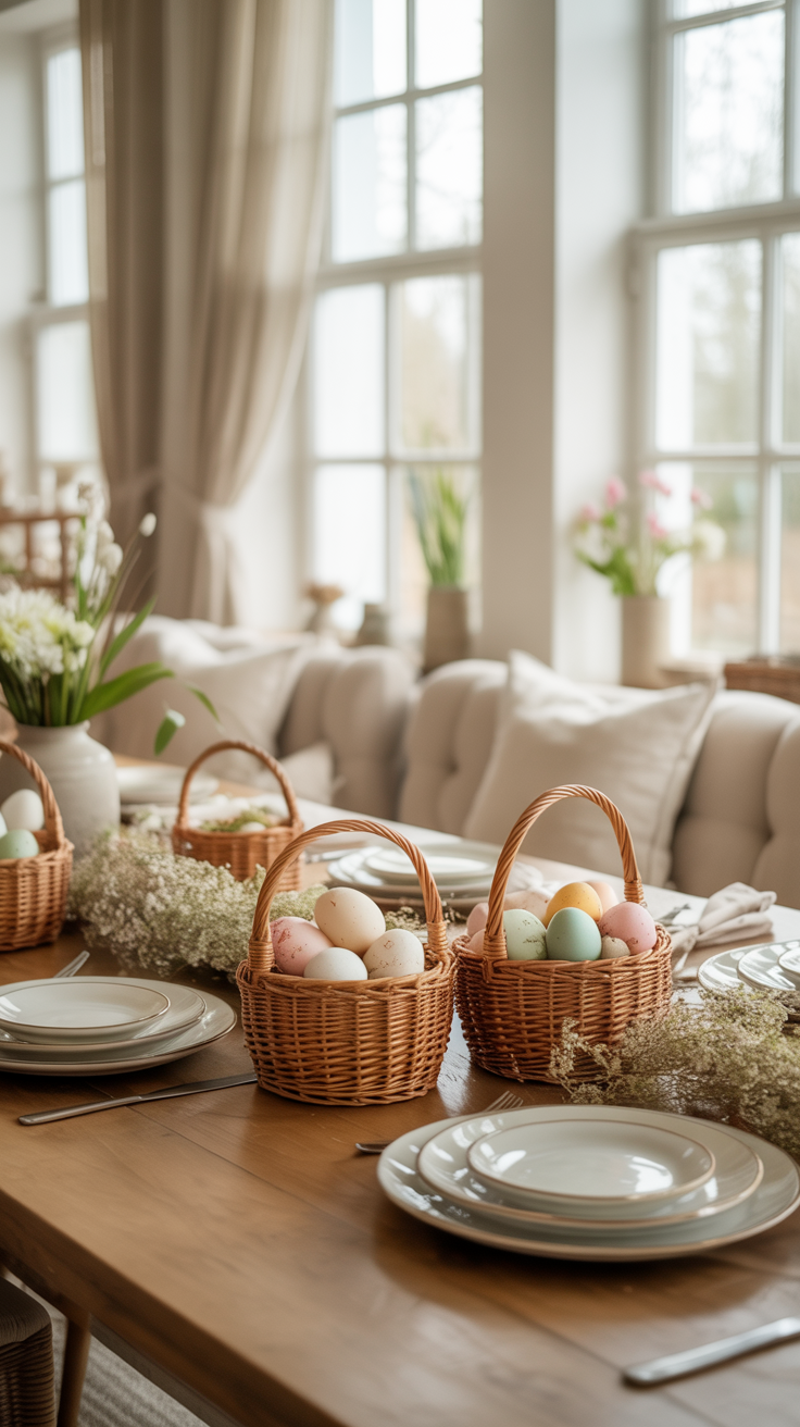 Binde aus Naturweide oder Rattangeflecht kleine Körbchen und lasse sie offen oder mit einem Deckel. Platziere darin Ostereier in verschiedenen Nuancen und verteile sie gleichmäßig am Tisch. Du kannst sie auch neben Teller und Besteck als kleine Überraschung für deine Gäste platzieren.